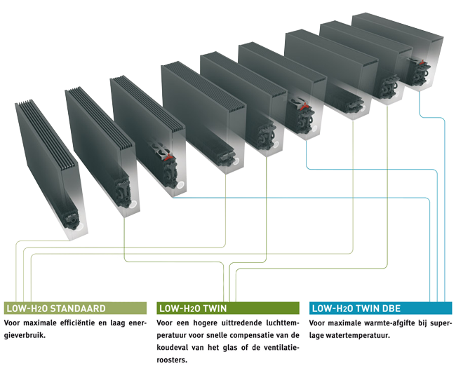 De Low-H2O radiatoren van Jaga bevatten tot 90% minder water dan traditionele radiatoren. Een kleine massa warmt veel sneller op dan een grote massa. Bovendien hebben ze geen zware stalen platen die eerst zichzelf moeten opwarmen. De ultramoderne warmtewisselaar van aluminium en koper geeft de warmte meteen door aan de ruimte. Deze technologie is terug te vinden in alle ontwerpen van Jaga. Hierdoor is er altijd een Jaga convector die bij jouw past.