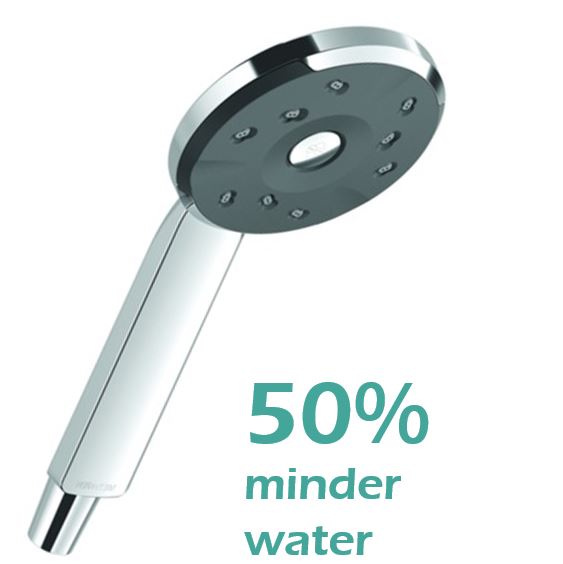 Een waterbesparende douchekop gebruikt slechts 5 tot 5,5 liter per minuut. Dat is en 50% minder dan een normale douchekop en 30% minder dan een reguliere ‘waterbesparende’ douchekop. Ook leverbaar in regendouche, combi uitvoering en uitvoering voor sportaccommodaties.