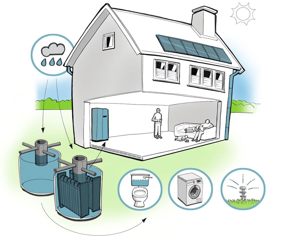 Gebruik het regenwater voor de tuin, toilet of wasmachine.