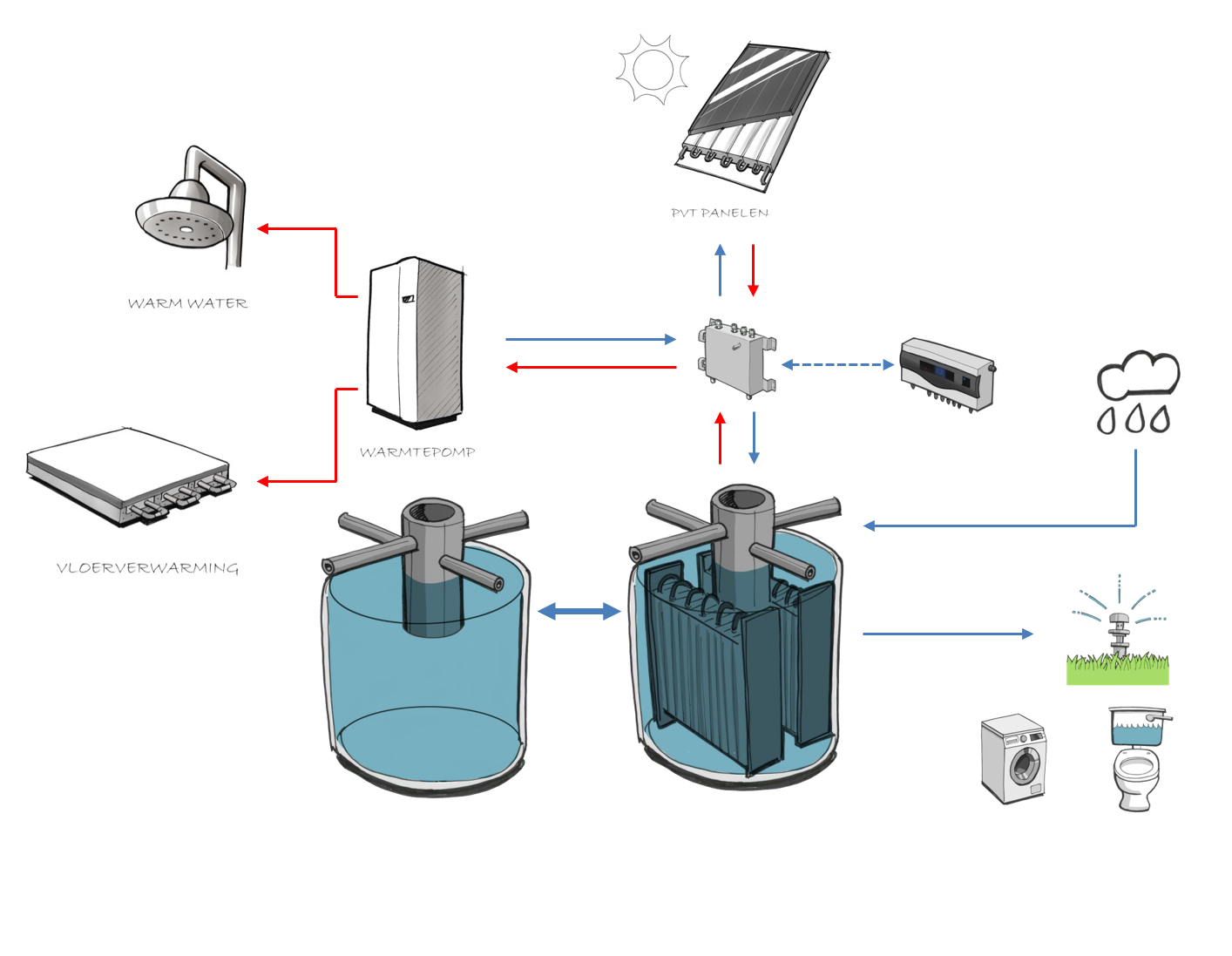 Dit is de buffer voor regenwater en thermische energie. Hierin is de warmtewisselaar voor de warmtepomp geplaatst.