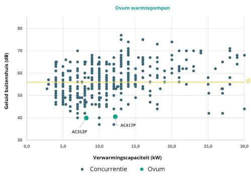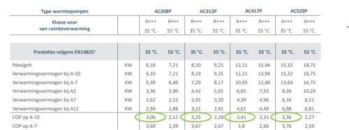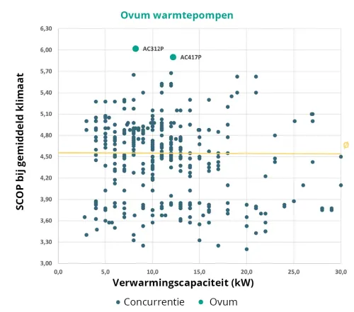 Alle Ovum warmtepompen leveren bij -10 graden en een afgifte op 35 graden, een COP van boven de 3. Dit is daarmee met afstand de zuinigste lucht/water warmtepomp-lijn van dit moment.