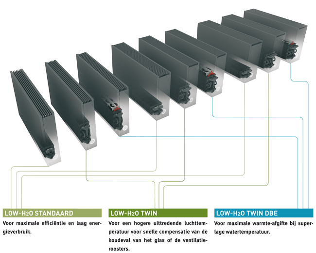 De Low-H2O radiatoren van Jaga bevatten tot 90% minder water dan traditionele radiatoren. Een kleine massa warmt veel sneller op dan een grote massa. Bovendien hebben ze geen zware stalen platen die eerst zichzelf moeten opwarmen. De ultramoderne warmtewisselaar van aluminium en koper geeft de warmte meteen door aan de ruimte. Deze technologie is terug te vinden in alle ontwerpen van Jaga. Hierdoor is er altijd een Jaga convector die bij jouw past.