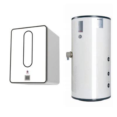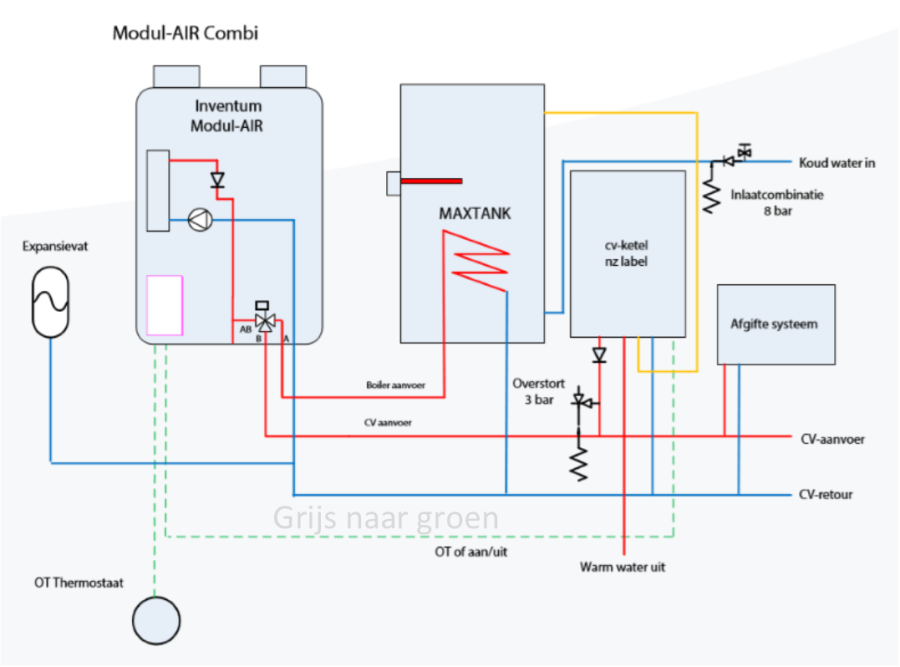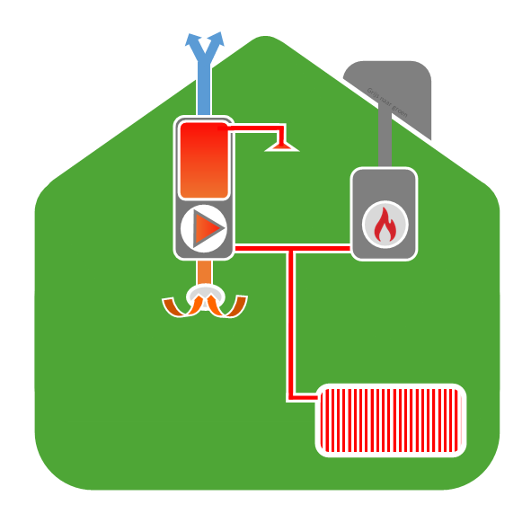 Wil je in een bestaande woning gas besparen, maar tapwater verwarmen via een boiler? Gebruik dan de combi-variant met de geïntegreerde 3-wegklep, die de keuze maakt tussen het verwarmen van tapwater uit de boiler of het verwarmen van cv-water. De cv-ketel vangt de pieken in warmtevraag, maar is later eenvoudig aan te passen naar een all-electric-verwarmingssysteem.
