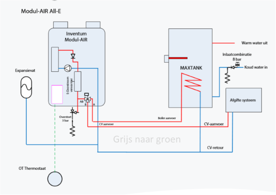 Deze variant is de All-E uitvoering met 3-wegklep en elektrische doorstroom verwarmer 1,5 kW, 3,0 kW of 4,5 kW. Voor tapwater sluiten we deze aan op de indirect gestookte boiler MAXTANK Modul-AIR 100L, 150L of 180L. Voor kleine woningen zoals studio’s is een boiler van 15 liter voor warm tapwater vaak al voldoende. Deze variant kan gecombineerd worden met E-radiatoren. Het heeft de voorkeur om E-radiatoren die op de slaapkamers worden toe- gepast te voorzien van een timer met een maximale tijd van 2 of 4 uur.